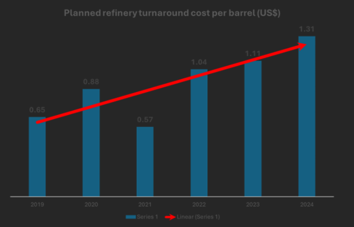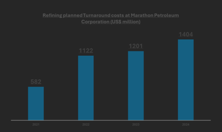 - Marathon Petroleum Corporation, one of the largest downstream specialists in the US, spent US$1.2 billion in planned turnarounds in 2024. This is about 1 percent of operating revenues. The planned turnaround cost figure is more than a quarter of the figure from income from continuing operations net of tax. This should put the TA problem in perspective. (Source: annual reports)